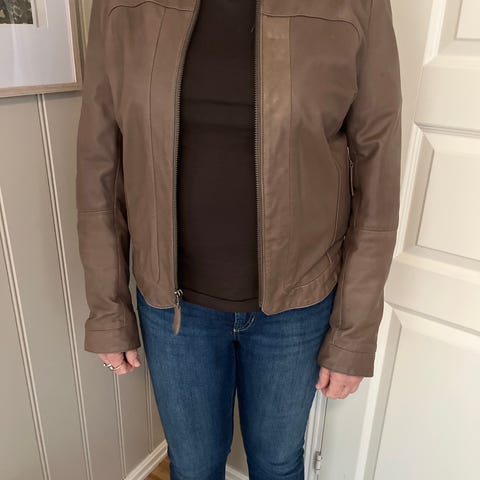 Mango skinnjakke for dame i størrelse S, men liten i størrelsen!Jakken er svart og laget i skinn . . Innsvingt midje og gir en flott timeglassfigur.Passer som ytterjakke i overgangssesonger eller til hverdagsbruk.