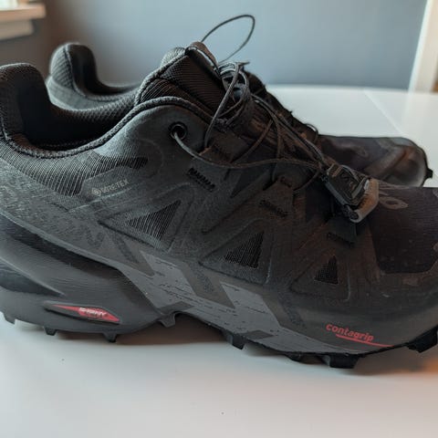 Salomon terrengsko i størrelse 44,5. Skoene er svarte og har grov yttersåle med markert mønster for bruk på sti og i terreng. Skoene har hurtigsnøring. Egnet til fottur og annen utendørs aktivitet der det er behov for stabile sko med godt grep. Selges da jeg har for mange sko.