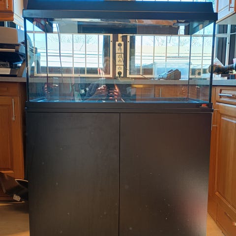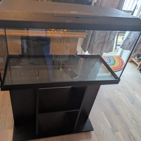 Akvarium med tilhørende skap i svart utførelse. Karet er i glass med rektangulær form og har svart topp og ramme. Skapet under har oppbevaringsplass med åpne hyller og dører med håndtak i metallfarge. Akvariet har toppdeksel med åpninger til teknisk utstyr som filter, lys og slanger. Egnet til innredning som ferskvanns- eller saltvannsakvarium avhengig av valg av utstyr og innhold. Passer til plassering i stue, gang eller andre oppholdsrom der det er behov for et større akvarium med integrert oppbevaring.