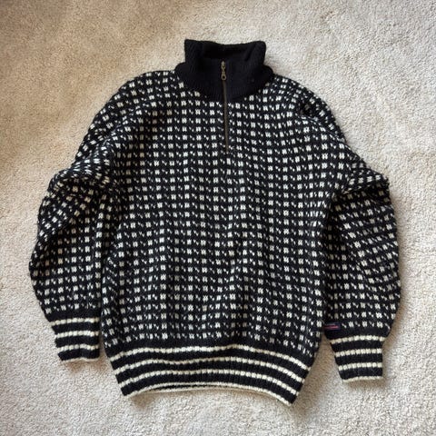 Ulvang ullgenser for herre i størrelse L. Genseren er grå/svart med lyst mønster og har høy hals med ribbestrikkede kanter på hals, ermer og nederkant. Materialet er ull, som gir god isolasjon og varme. Passer til bruk i kaldt vær, for eksempel til tur, fritid eller som mellomlag under yttertøy.