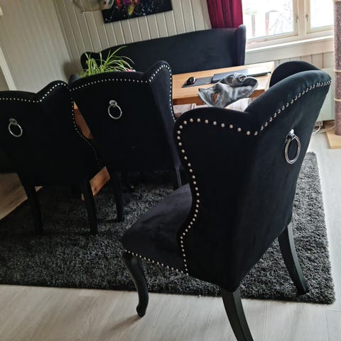 Spisestue sett 4 stoler og 1 sofa som er ca 150cm lang i svart tekstiltrekk med dekorative metallnagler langs kantene og ringbeslag på stolryggen. Stolen har høy rygg med vinger og buede stolben i mørkt tre. Egnet som spisestuestol rundt spisebord eller som ekstra stol i stue eller kjøkkenkrok. Pris kan diskuteres ved rask avgjørelse.