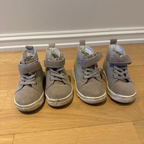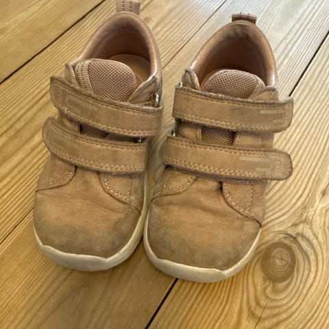 Kavat barnesko i størrelse 20. Skoene har to borrelåser over vristen for enkel av- og påkledning. Brukt som første skoene til tvillinger, var veldig fornøyde med de. 150kr totalt.