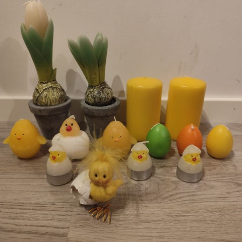 Her er blant annet strikkede kyllinger, høner, eggevarmere, stearinlys og lysmansjetter. Gir masse påskestemning eller kan brukes som ingredienser til påske-verksted.