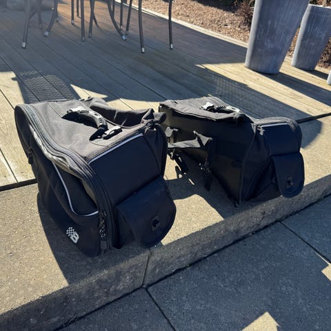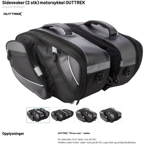 Bagster Spider sidevesker for motorsykkel i tekstil. Sett med to vesker som monteres på hver side av baksetet. Total kapasitet er ca. 50–60 liter, avhengig av utvidelse. Farge svart med kontrastdetaljer og Bagster-logo. Veskenes form er tilpasset montering over bakhjulet, og de har bærehåndtak på toppen. Egner seg for oppbevaring av bagasje på tur og pendling med motorsykkel.