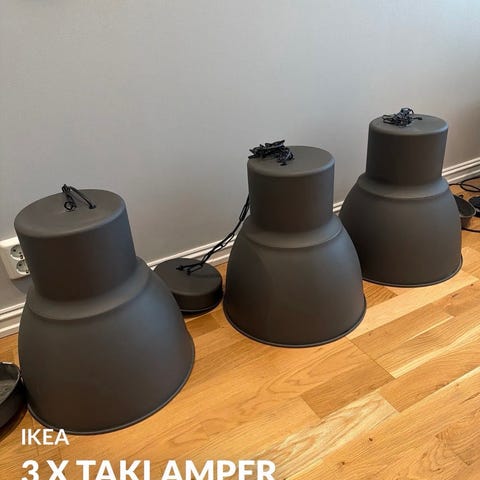 Tre lamper selges samlet. Hektar taklamper fra IKEA, mørk grå.