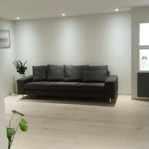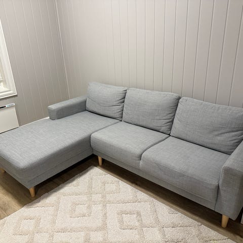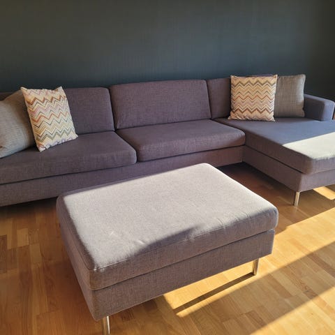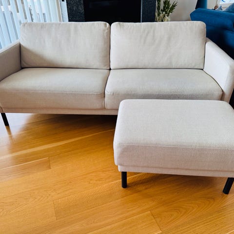 Copenhagen 3-seters med fotskammel fra Trademax selges, kjøpt ny i juni 2023. Har noen få flekker, men på grunn av stoffet er disse lite synlige. Selges grunnet flytting. Nypris for sofa og fotskammel: 17 998kr.