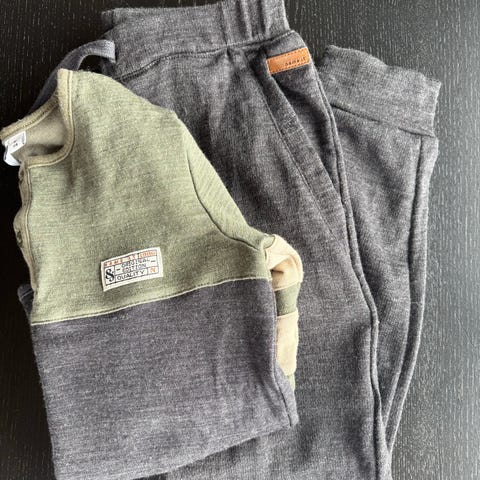 Moods of Norway ullsett til gutt i størrelse 116. Settet består av overdel med lange ermer og bukse i myk merinoull. Fargen er blå med mønster. Buksen har strikk og snøring i livet samt lommer i siden. Materialet i merinoull egner seg godt som innerste lag til hverdagsbruk og utendørsaktiviteter.