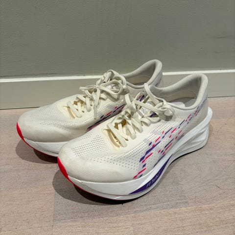 Asics Superblast 2 løpesko i størrelse 43,5. Farge turkis. Skoene har overdel i pustende mesh-materiale og mellomsåle med demping egnet for løping. Yttersålen har mønster som gir grep på asfalt og lignende underlag. Passer til løping og annen trening der det er behov for lette og dempede sko.