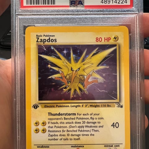 Pokémon Zapdos spesialsamlekort gradert PSA 9. Kortet er innkapslet i PSA-hardplast med etikett som angir årgang, kortnavn og vurdering. Standard Pokémon-bakside. Egner seg for samling og oppbevaring i beskyttende etui eller display sammen med andre graderte Pokémon-kort.