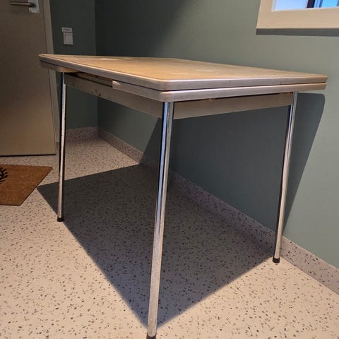 Gratis spisebord med stolene mot henting. Målene er 120cm L x 76cm bredt. Glassplate på spisebordet. Hentes på Kurland