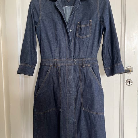 Kjolen er blå og laget av 100 % bomull. Modellen har krage, knappelukking foran og lange ermer. Brystlommer med klaff og knapper gir et skjorteinspirert uttrykk. Myk og god.