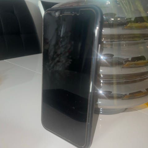 Telefonen har dobbelttkamera på baksiden og hel frontskjerm. På bildene følger det med to deksler og et kablet øreproppsett. Baksiden viser Apple-logo og kameramodul øverst til venstre. Frontskjermen har noen synlige riper.