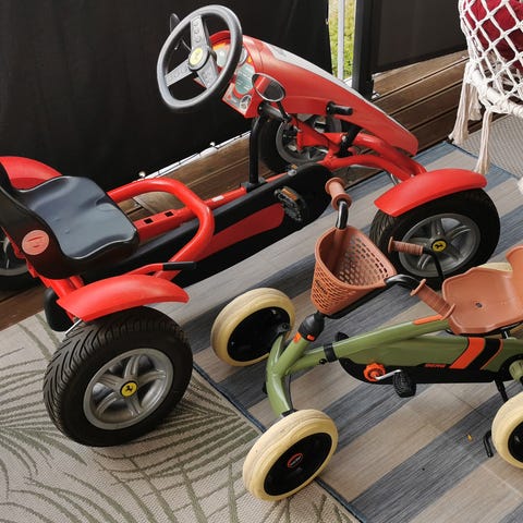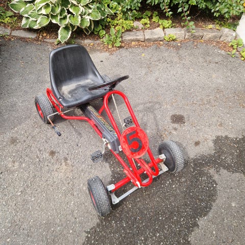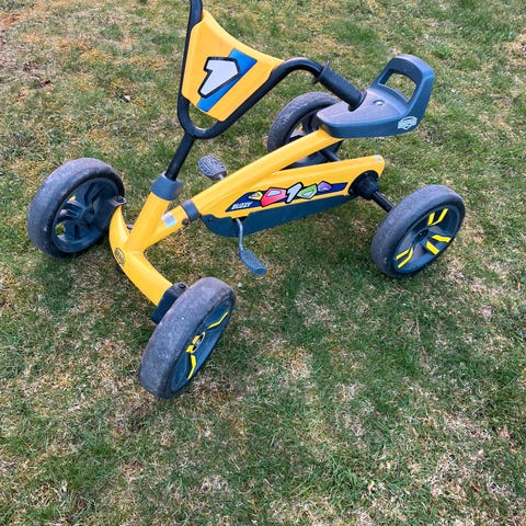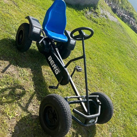 Berg tråbil med solid ramme i svart og blått sete. Modellen har fire store luftfylte hjul, rattstyring og justerbart sete som kan tilpasses ulike brukere. Egnet for utendørs bruk på gress, grus eller asfalt. Tråbilen drives ved hjelp av pedaler og gir mulighet for aktiv lek og trening av motorikk for barn.