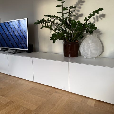 Selger to Bestå tv benker som begge er 180b x 42d x 38h. Hylle i alle skap. Stått på ubrukt tv rom.