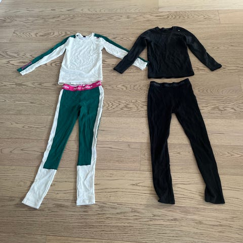 Ullundertøysett til barn i størrelse 140. Sett med overdel og underdel i gul og mørk blå farge. Plagget har lange ermer og lange ben, og er egnet som innerste lag til hverdagsbruk eller til uteaktiviteter i kjøligere vær.