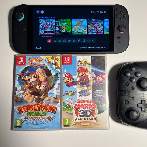 Nintendo switch konsoll selges med etui, kontroll og spill.