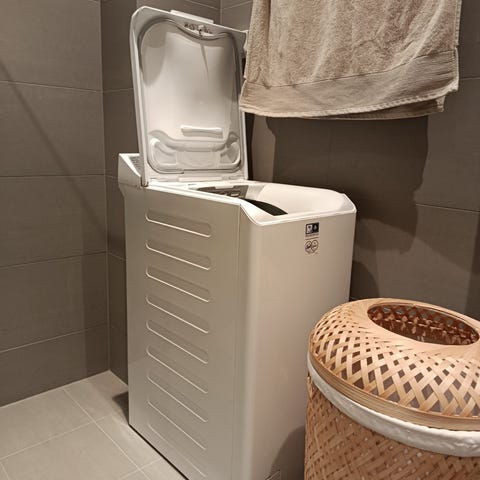 6kg kapasitet, kompakt (kun 40cm bred, 60cm lang, 85cm høyt) og plassbesparende, samt veldig funksjonell og praktisk. Fungerer perfekt, ikke noe å bemerke. Selges bare fordi jeg har omorganisert badet.