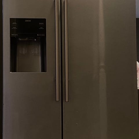 Stilig Samsung side‑by‑side kombiskap med fryseskap på den ene siden og kjøleskap på den andre. Skapet har integrert is- og vanndispenser i døren, betjent via panel på fronten. Dører i rustfritt stål. Noen bruksmerker på sidene, men ikke foran. Må hentes.