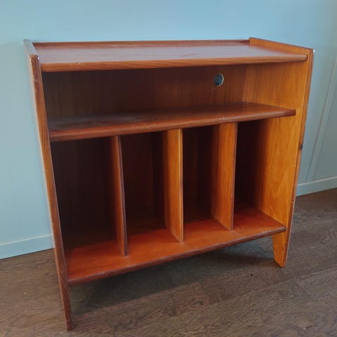 Flott vintage stereobenk i teak, laget for platespiller og vinylplater. Klassisk skandinavisk design med høye ben og varme trefarger som passer fint i både retro og moderne hjem.