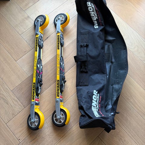Swenor Skate rulleski med sko og staver selges samlet. Rulleskiene er utstyrt med bindinger til skøyting. Det følger et par Fischer skøytesko med ankelstøtte, samt et par staver med asfaltspisser. Egner seg til skøyting på asfalt og andre harde underlag. Sko str. 42. Stavene er 155cm.