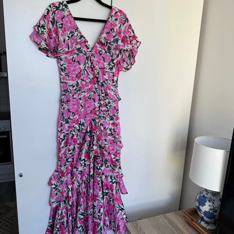 ByTimo omslagskjole i størrelse S. Kjolen har et flerfarget blomsterprint. Modellen har omslagsoverdel med V-utringning og korte, vide ermer.