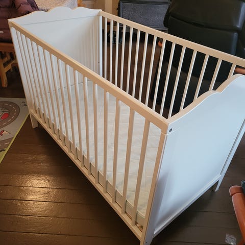 IKEA sprinkelseng i hvit utførelse. Klassisk barneseng med lamellbunn og sprosser på alle sider, egnet for små barn. Sengen har rektangulær form og er laget i treverk med malt overflate. Passer som fast seng på barnerommet eller som ekstra seng hos besteforeldre eller i gjesterom. Madrass og sengetøy kan brukes etter eget behov og følger eventuelt med etter avtale med selger.