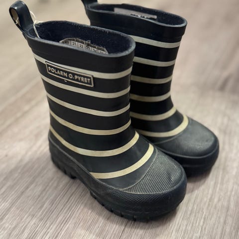 Polarn O. Pyret gummistøvler for barn i størrelse 21. Modellen er svart med lyse horisontale striper og kraftig såle med grovt mønster. Unisex-modell som passer både gutter og jenter. Støvlene er laget i gummimateriale som egner seg til bruk i regnvær og vått underlag, for eksempel i barnehage eller på tur.