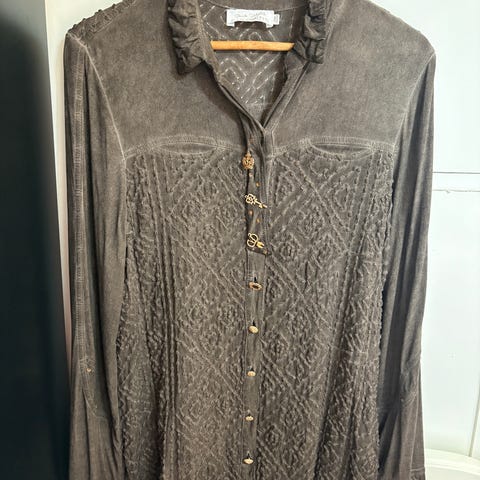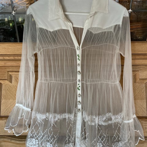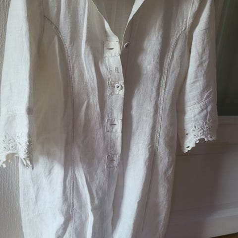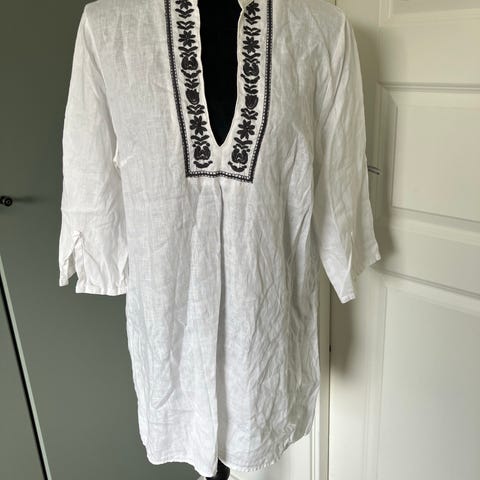 Elisa Cavaletti bluse for dame i størrelse L. Blusen er hvit og laget av 100 % bomull. Modellen har lange ermer, V-utringning og asymmetrisk avslutning nederst. Dekorative broderier og kontrastbånd i blått foran, på ermene og rundt livet. Knytebånd bak for justering av passform. Passer som lett overdel til hverdagsbruk eller til mer pyntede anledninger.