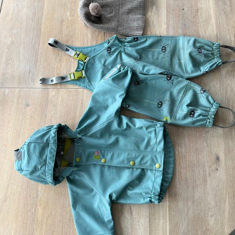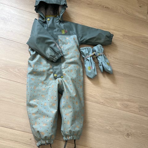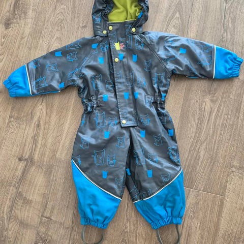 Regnvotter str 0-1år i lyseblå. Foret med tynn fleece. Et par merker i gummien, men sønnen min ble aldri våt igjennom med mindre han badet i vanndammene i barnehagen.