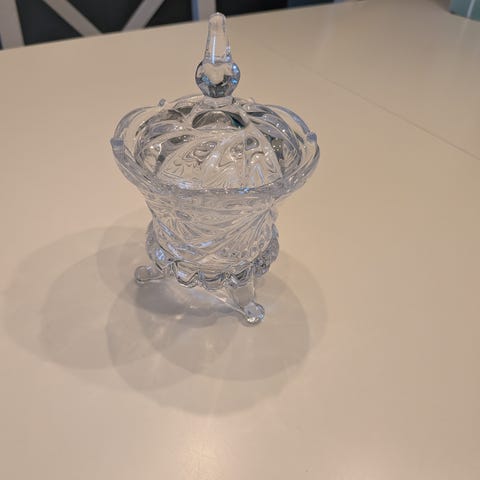 Dekorativ skål i klart glass/krystall med lokk og tre føtter. Perfekt til godteri, sukkerbiter eller som pynt.