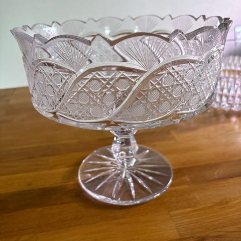 Liten krystallskål med lokk selges.