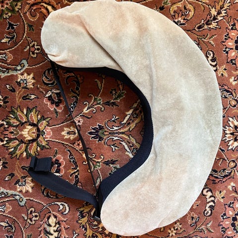 Cozyfix ammepute i beige. Puten festes rundt livet med justerbar stropp og klips, slik at den sitter stabilt under amming. Overdelen har myk tekstilflate og selve puten er fast og stabil, Den beste ammeputen jeg har hatt.
