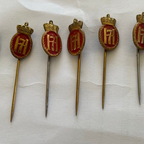 Håkon VII Nål med emaljert merke i rødt og gullfarget metall. Merket har krone øverst og er festet på en lang nål. Baksiden er stemplet «925 S», som indikerer sølv med forgylt overflate. Egner seg som jakkemerke, slipsnål eller til annen pynt på klær og tilbehør.