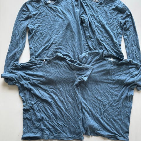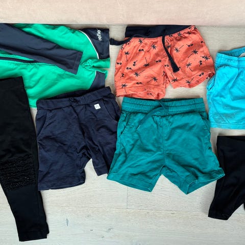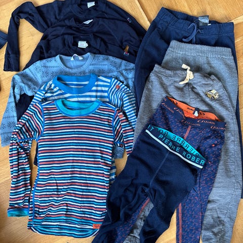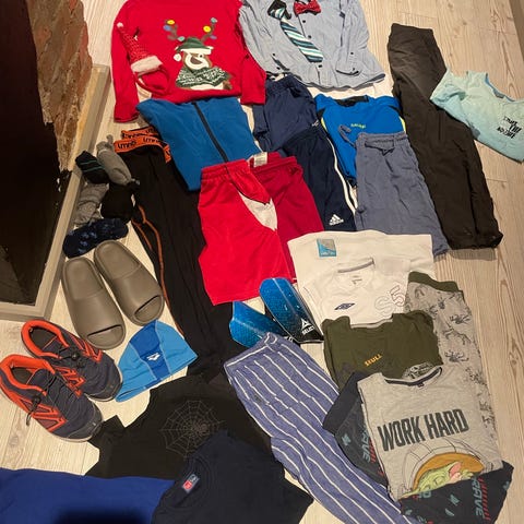 Fint brukt eller nye klær. Det er to små hull i den eine ulltrøya. Linskjorta i str 140 er brukt ei gang. Finbuksa er i str 134. Den er noe nupper på. Ser at den er brukt.