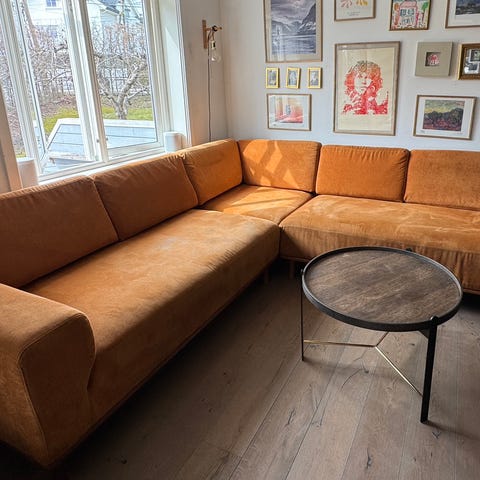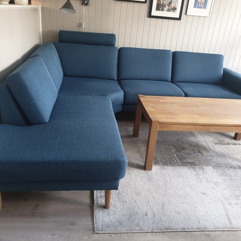 Fin blå Vilmers Hjørnesofa. Den er veldig komfortabel å sitte i, og veldig enkel å vaske. Trekkene er avtakbare. Kan leveres helt gratis.