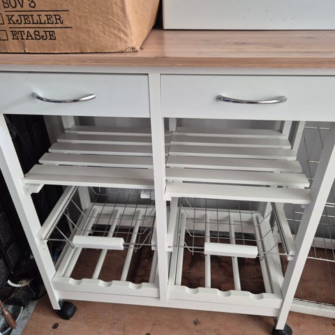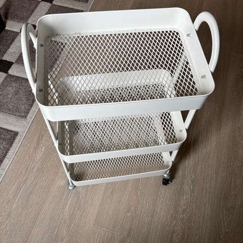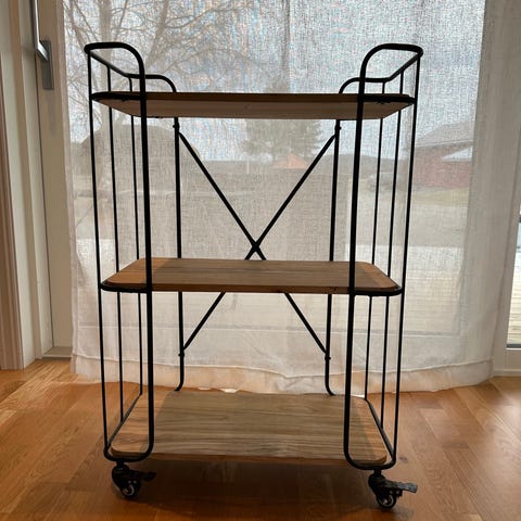 Pent brukt trillebord fra søstrene grene. Trillebordet har 3 hyller.