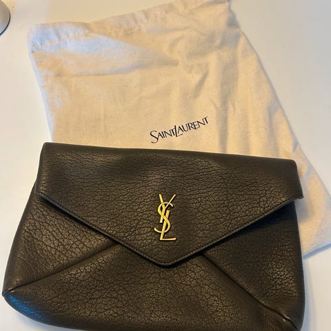YSL clutch veske for dame i stoff. Vesken har svart ytterstoff og lys klaff med YSL-logo. Innvendig er det et hovedrom med glidelåslomme, samt en liten speildetalj under klaffen. Lukkes med magnetknapp. Egner seg til oppbevaring av småting som nøkler, mobil og sminke ved bruk til hverdags eller ved mer formelle anledninger.