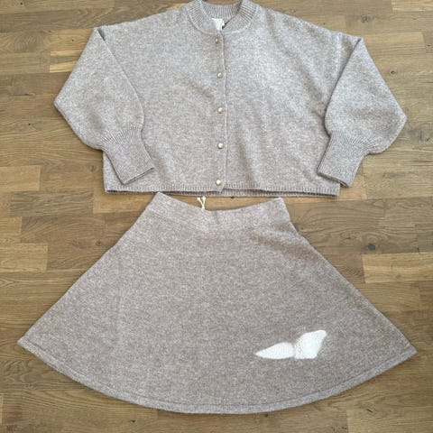 Beige sett fra Arnie Says; kort skjørt med for, sidelommer og glidelåslukning og tilhørende jakke (også foret) i avslappet litt oversized stil (bomber-fasong). Vaksbart materiale, se siste bilder.