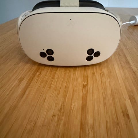 Meta Quest 3 VR-headsett i hvit farge med tilhørende håndkontrollere. Headsettet har frontkameraer og sensorer for romsporing, justerbar hodestropp og polstret ansiktspute for bedre passform. Egnet til VR-spill og apper som støtter Meta Quest-plattformen. Passer for brukere som ønsker trådløs VR-opplevelse uten separat spillkonsoll eller PC, der innholdet kjøres direkte på headsettet eller via kompatibel tilkobling.