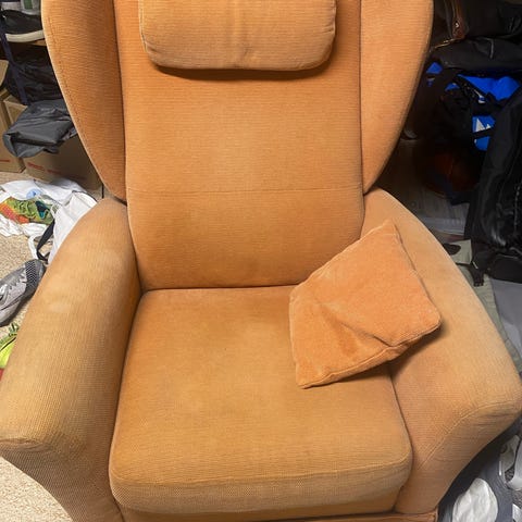 Kan hentes på Harestua. Kjøper må selv bære ut lenestol og puff.