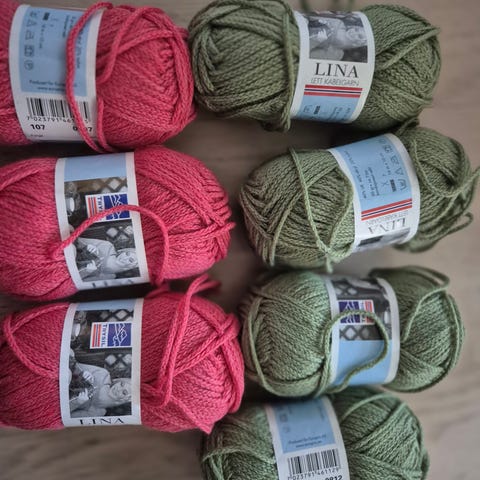 Thea garnpakke med flere nøster akrylgarn i grønn og rosa farge. Garnet er 100 % akryl og egner seg til strikking og hekling av plagg og tilbehør. Nøstene har samme kvalitet i begge farger, med oppgitt strikkefasthet og vaskeanvisning på banderolen. Pakken inneholder både hele nøster og mindre rester, som kan brukes til større prosjekter eller som kontrast- og restegarn.