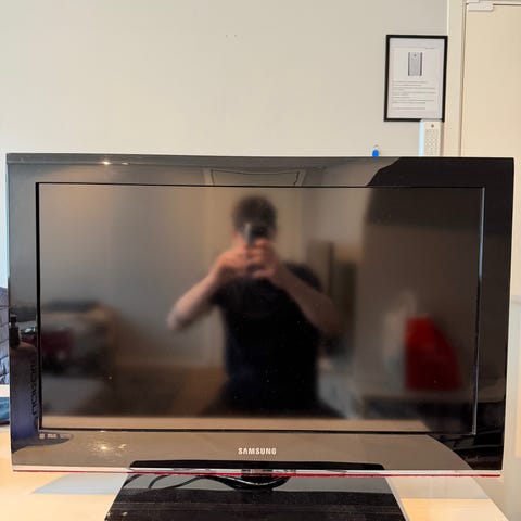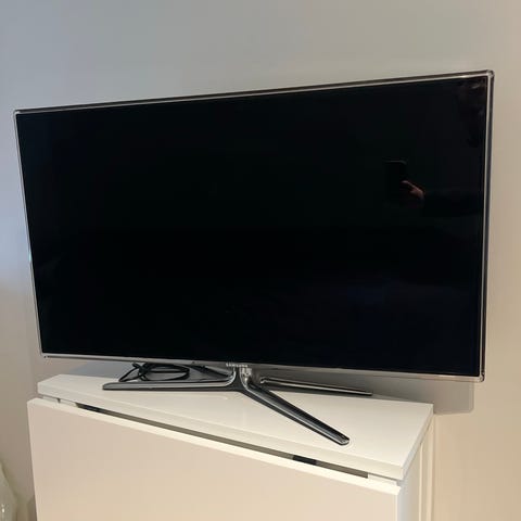Samsung TV med medfølgende fjernkontroll. TV-en har flere tilkoblingsmuligheter på baksiden, blant annet HDMI-innganger, komponent- og komposittinnganger, SCART, VGA (PC-inngang), antenneinngang og USB-port. Egnet for tilkobling av ulike eksterne enheter som dekoder, spillkonsoll, PC eller mediespiller, avhengig av kompatibilitet med utstyret som brukes.