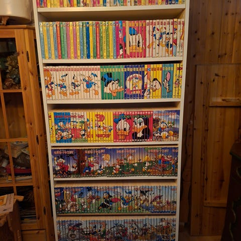 Disney Donald Duck og Onkel Skrue tegneserieblader i blandet samling. 218 eksemplarer tegneserieblad og 6 pocketbøker. Inneholder flere hefter med ulike utgaver og forsider, blant annet Onkel Skrue og Donald Duck & Co. Tegneseriene er på trykt papir i magasinformat. Egner seg for lesing, samling eller som tilskudd til eksisterende tegneseriesamling. Antall hefter og årganger kan variere i samlingen.