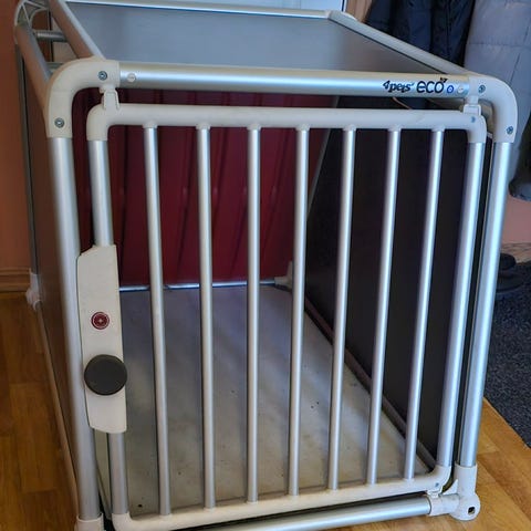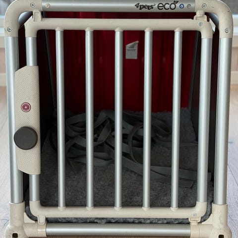 4pets ECO hundebur i metall. Buret har skrå bakside tilpasset bilbagasjerom og gitterdør i front. Rammen er laget i metall med sideplater for økt stabilitet. Egnet som transportbur for hund i bil eller som fast liggeplass hjemme. Utformet for å gi hunden et avgrenset og trygt område under transport og opphold.