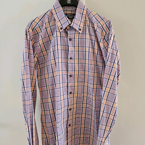 Ukjent merke rutete skjorte for herre i størrelse L. Skjorten er flerfarget med små ruter og er laget av bomull. Modellen har lange ermer, krage og knappelukking foran. Passer til hverdagsbruk eller mer formelle anledninger avhengig av styling.