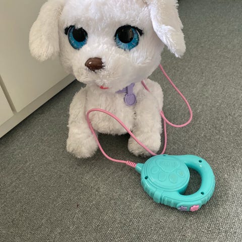 Lite brukt hun som går og bjeffer. Er med bånd som man trykker på for å få hunden til å bevege seg og lage lyder.