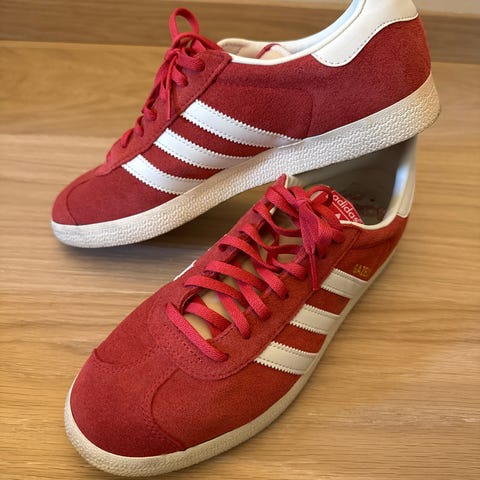 Adidas sneakers i størrelse 38. Skoene er røde med hvite Adidas-striper og hvit såle. Overdelen ser ut til å være i semsket materiale med snøring foran og polstret pløse med Adidas-logo. Modellen passer til hverdagsbruk og lett fritidsaktivitet.