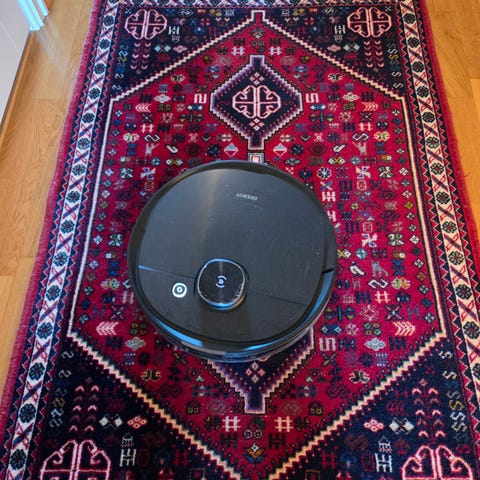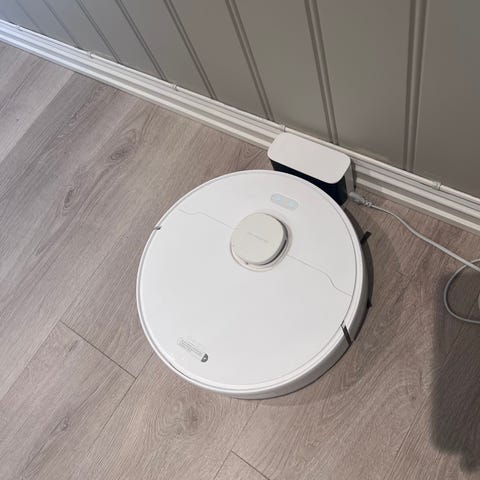 Ecovacs Deebot robotstøvsuger i svart utførelse. Enheten er rund med toppmontert sensor og kontrollknapp. Passer til automatisk støvsuging av gulv i hjemmet. Leveres med strømkabel som vist på bildet.