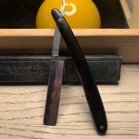 Antikk svartmalt etui for oppbevaring av barberkniv og utstyr