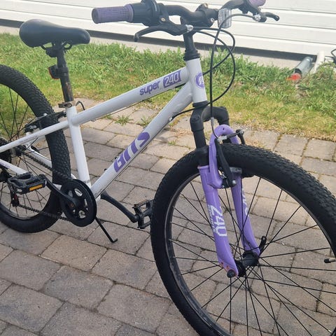 Barnesykkel med 24" hjul. Sykkelen har hvit ramme med blå detaljer og er tilpasset barn. Utstyrt med flat styre, standard barnesete og pedaler. Egnet til hverdagssykling og turbruk for barn som passer 24" hjulstørrelse.